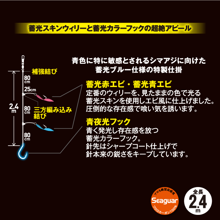 より詳しい情報は、シマアジ蓄光青エビ・赤エビ&青夜光フック2.4m3本鈎【2026新製品】 のメーカーページをご覧ください